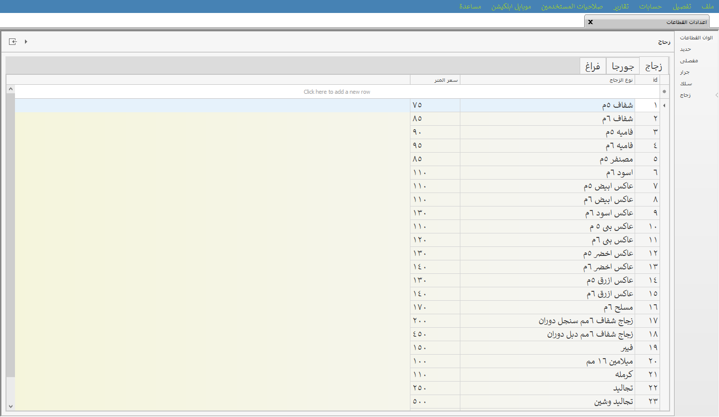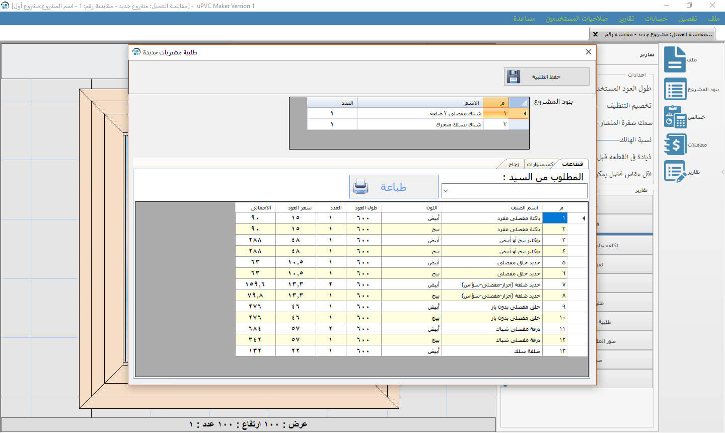 عمل طلبية مشتريات مفصلة (زجاج - قطاعات وحديد - اكسسوارات) | ||