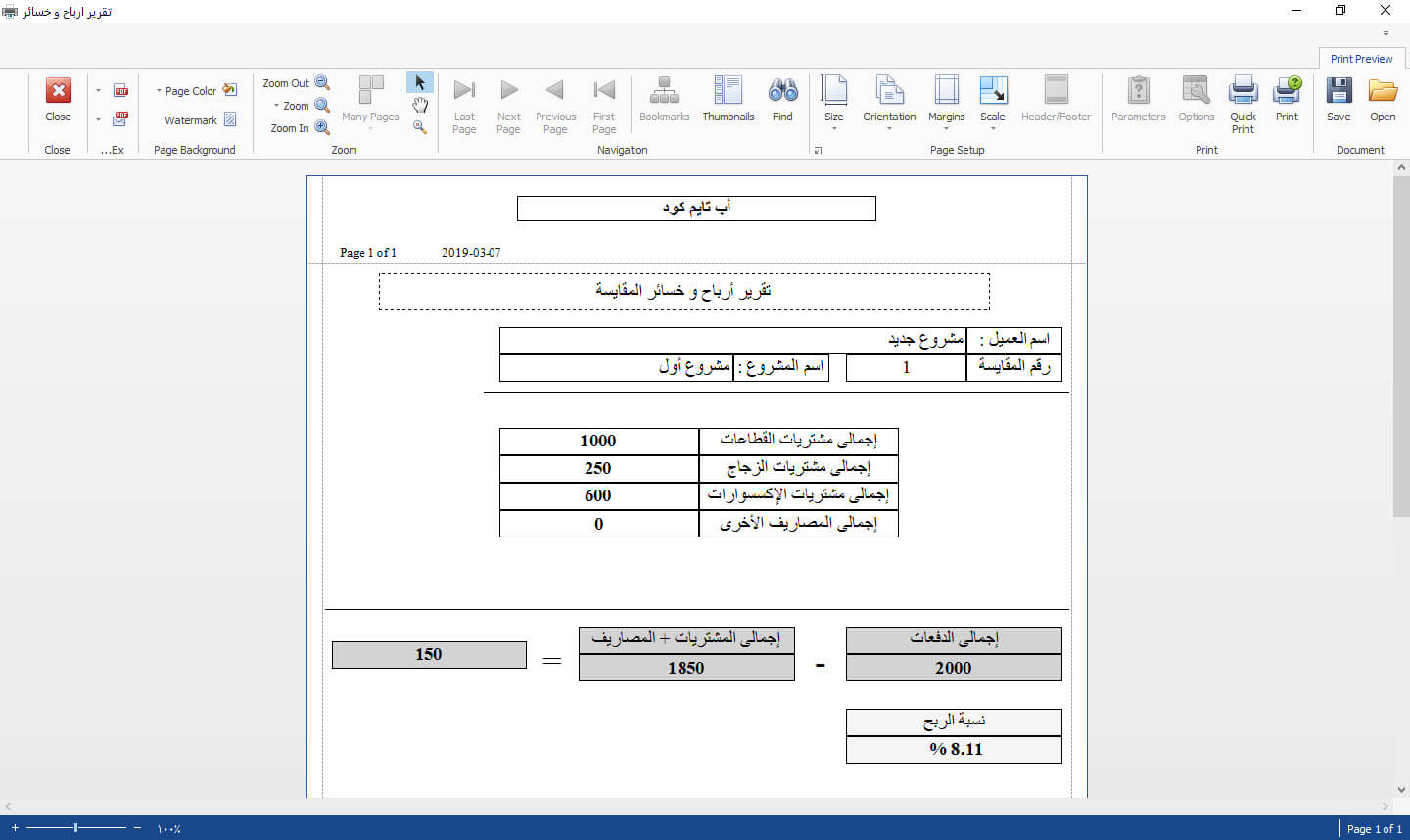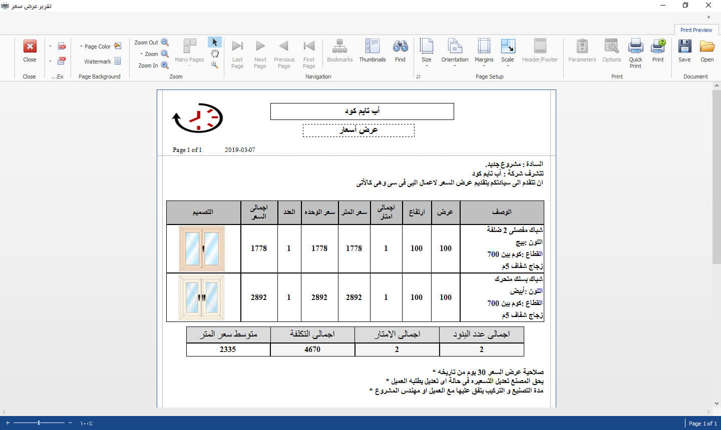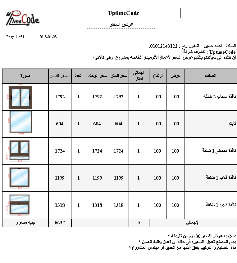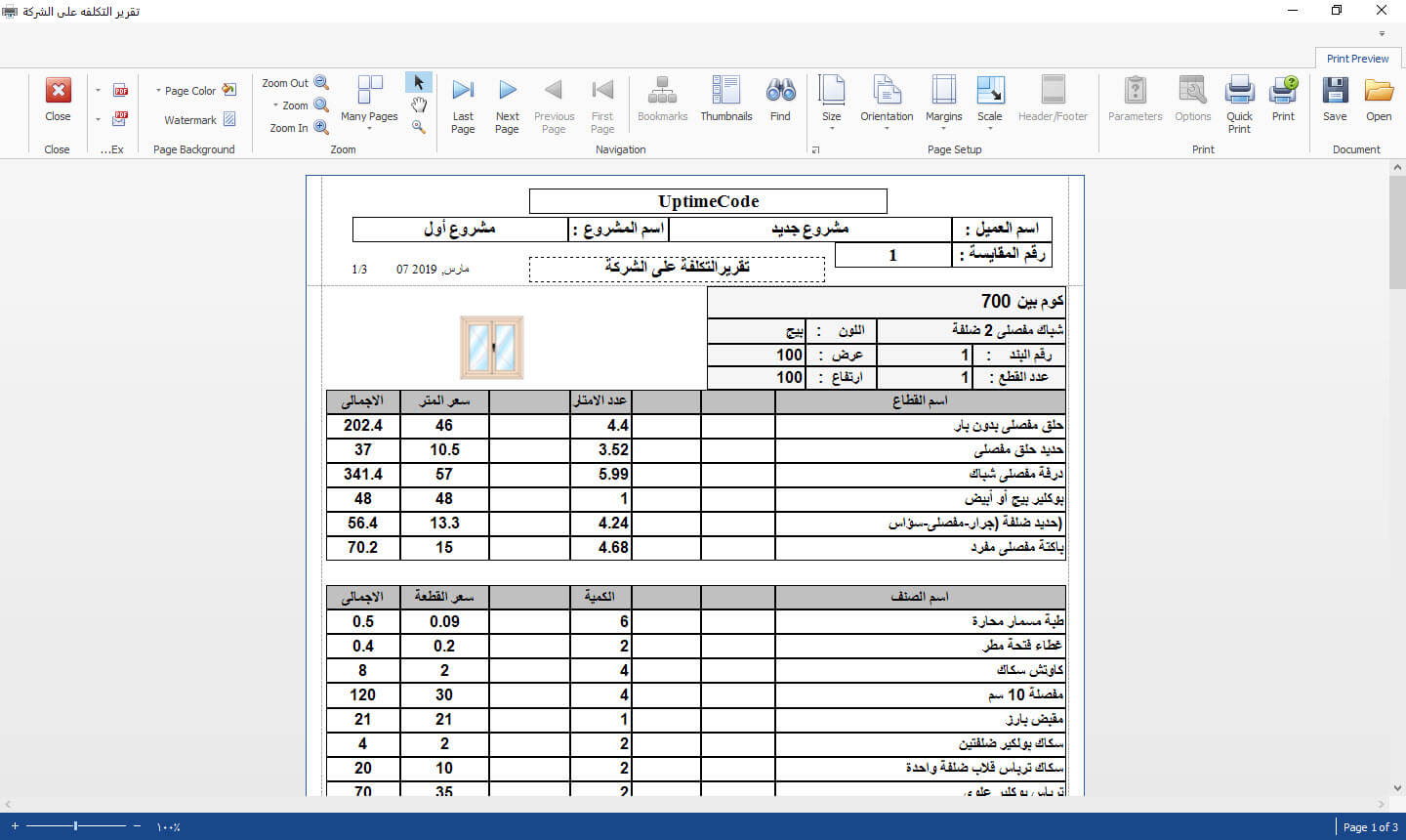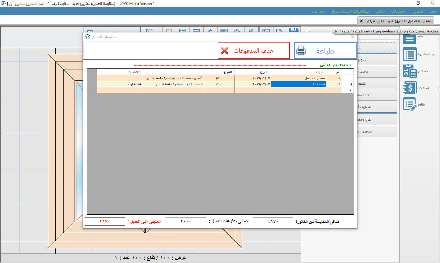 1-سهولة الاستخدام والتعامل مع البرنامج مع وجود كورس تعليمي كامل 2-وجود خدمة الدعم الفني مدى الحياة 3-البرنامج يحتوي على قطاعات الـ يو بي في سي والتخصيمات والاكسسوارات الخاصة بالقطاعات مع إمكانية التعديل على القطاعات الموجودة أو إضافة قطاع جديد 4-البرنامج يحتوي على ألوان القطاعات مع إمكانية إضافة لون جديد أو التحكم في حذف أو تعديل الألوان الموجودة 5-يوجد على البرنامج رسومات جاهزة لأشكال الأبواب والشبابيك بالإضافة إلى إمكانية الرسم اليدوي 6-تقارير البرنامج **التصنيع والتسعير** -تقرير التكلفة على الشركة قبل التنفيذ -تقرير عرض أسعار للعميل -طباعة فاتورة العميل -طلبية مشتريات مفصلة (أعواد - اكسسوارات - زجاج) -تقرير تقطيع الأعواد - الحديد -تقرير تجميع لكل بند -تقرير صور للمقايسة -تقرير أمر الشغل (التركيب) **حسابات المقايسة والمعاملات** -تسجيل حركة مدفوعات العميل -حسابات الموردين (آجل - نقدي ) (سداد-تحصيل) -تسجيل المشتريات الفعلية -أرباح وخسائر المقايسة الفعلية